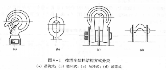 按滑車懸掛結構方式(或稱連接方式)分為吊鉤式、鏈環式、吊環式和吊梁式4種,如圖4—1所示。