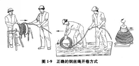 鋼絲繩通常總是成卷(盤)供應的,一卷鋼絲繩的長度有多種規(guī)格,如250m、500m和1000m等。多層建筑施工用的塔式起重機的起升鋼絲繩通常為100-150m,而中高層建筑施工用的塔式起重機的起升鋼絲繩長尾250-350m,超高層建筑施工用的塔式起重機的起升鋼絲繩往往長度達500m或更長一些。鋼絲繩的開卷方式如圖1-9所示。