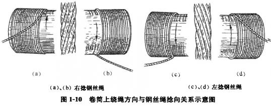 1、纏繞。如由鋼絲繩卷直接往起升就卷筒上纏繞時,應注意兩點:一是應把整卷鋼絲繩架設在專用的旋轉(zhuǎn)托架或支座上,松卷時的轉(zhuǎn)動方向應與起升機構(gòu)卷筒上纏繞的方向一致;而是卷筒上的繩槽走向應同鋼絲繩的捻向相適應。如果鋼絲繩在繩槽方向是從左向右,鋼絲繩是右捻,要從卷筒上方引入卷繞,如圖1-10(a)所示;倘若鋼絲繩在繩槽走向是從右向左,鋼絲繩是右捻,則要從卷筒下方引入卷筒,如圖1-10(b)所示;若鋼絲繩在繩槽走向是從左向右,鋼絲繩是左捻、要從卷筒下方引入卷繞,如圖1-10(c)所示;如果鋼絲繩在繩槽走向是從右向左,剛繩是左捻,則要從卷筒上方引入卷繞,如圖1-10(d)所示。
