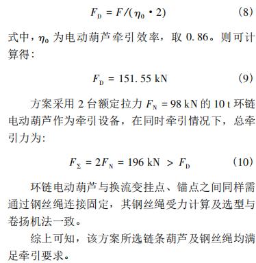 環鏈電動葫蘆與換流變掛點、錨點之間同樣需通過鋼絲繩連接固定,其鋼絲繩受力計算及選型與卷揚機法一致。綜上可知,該方案所選鏈條葫蘆及鋼絲繩均滿足牽引要求。