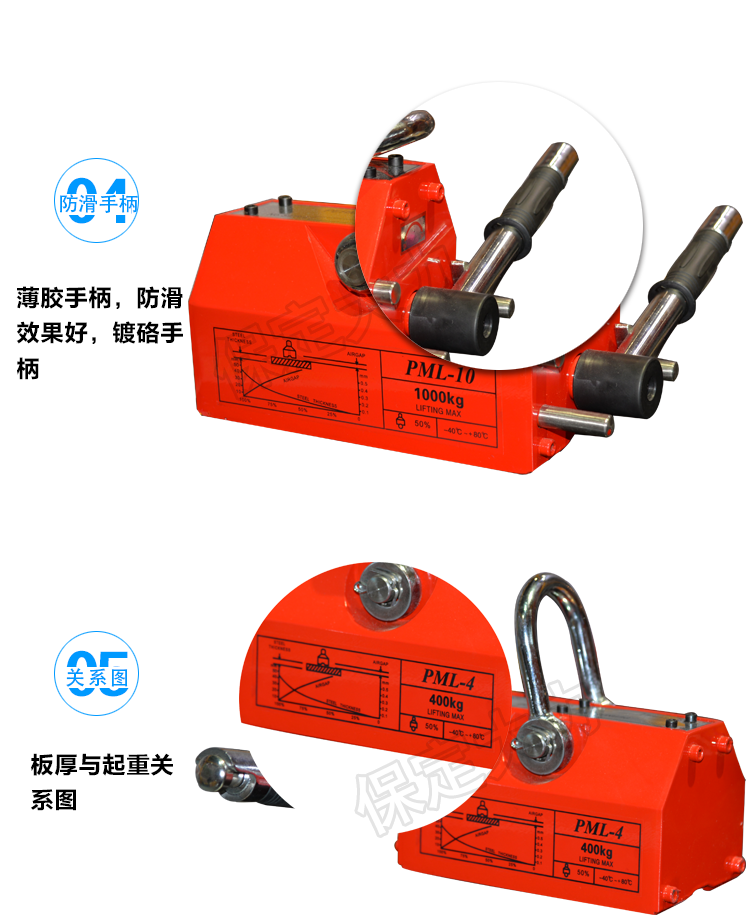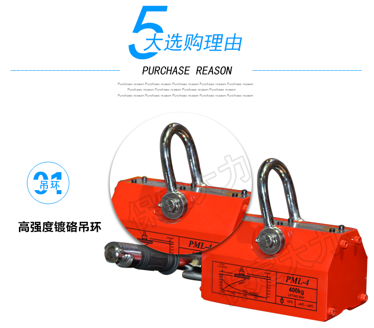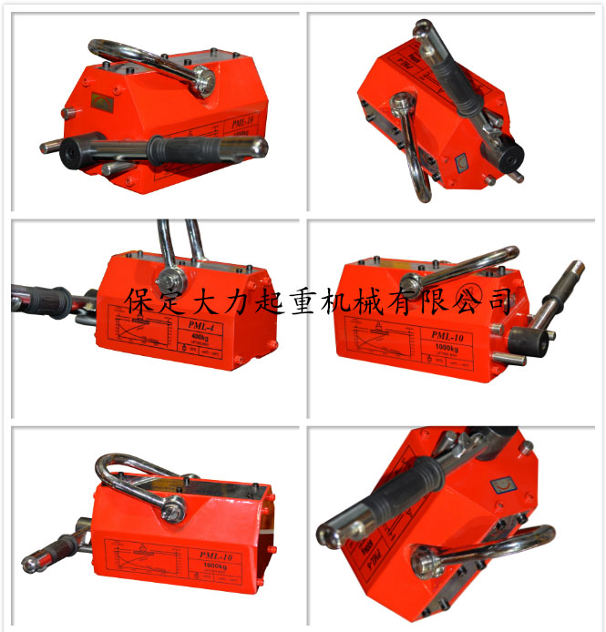 永磁起重器,全部采用N 4 O高牌號釹鐵繃為磁源,內部磁路設計合理、結構獨特、焊接材料特殊、密封性能好、外觀設計別致、定位正確。因此該產品與國內同類產品相比、具有體積小、吸力大、剩磁小軸頭不易斷裂、壽命長等各種優點。