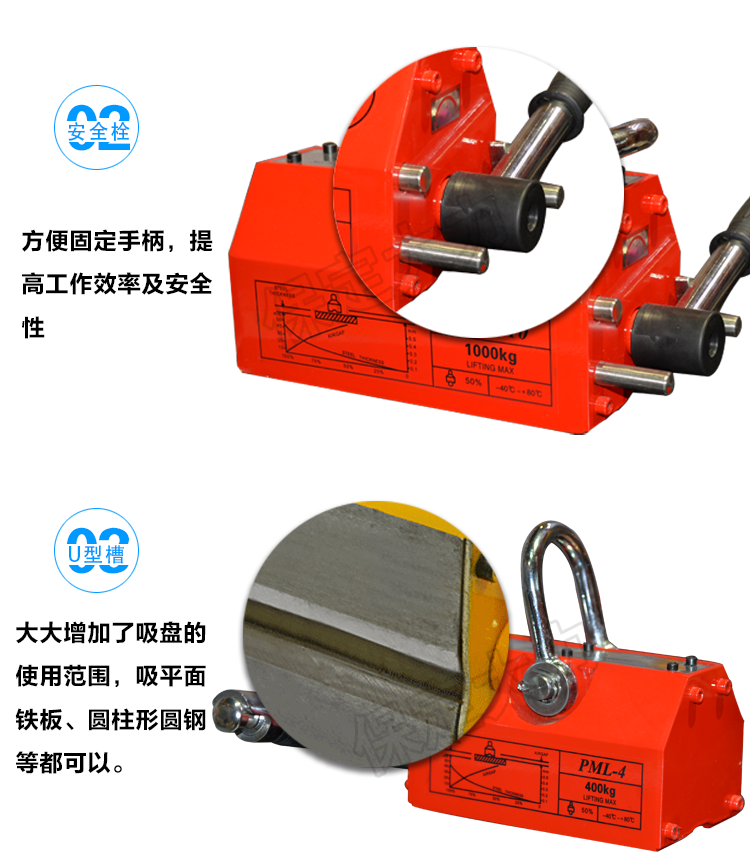 永磁起重器主要的一點不需用電。這種永磁起重器是一種無電源起重設備。永磁起重器吸力安全系數×3.5倍,永磁起重器采用高性能稀土永磁一釹鐵硼為磁源,具有不耗電,吸力強、剩磁低、操作輕便、壽命長、安全可靠等特點,永磁起重器結構先進,按照出口標準組織生產。永磁起重器廣泛用于機械工業、模具制造業、倉庫和交通運輸等部門搬運鋼板、鋼錠等導磁性物體。 永磁吸盤適用于搬運鋼板、鐵塊及圓柱鐵材。如機械零件、沖床模具及各類鋼鐵材料。