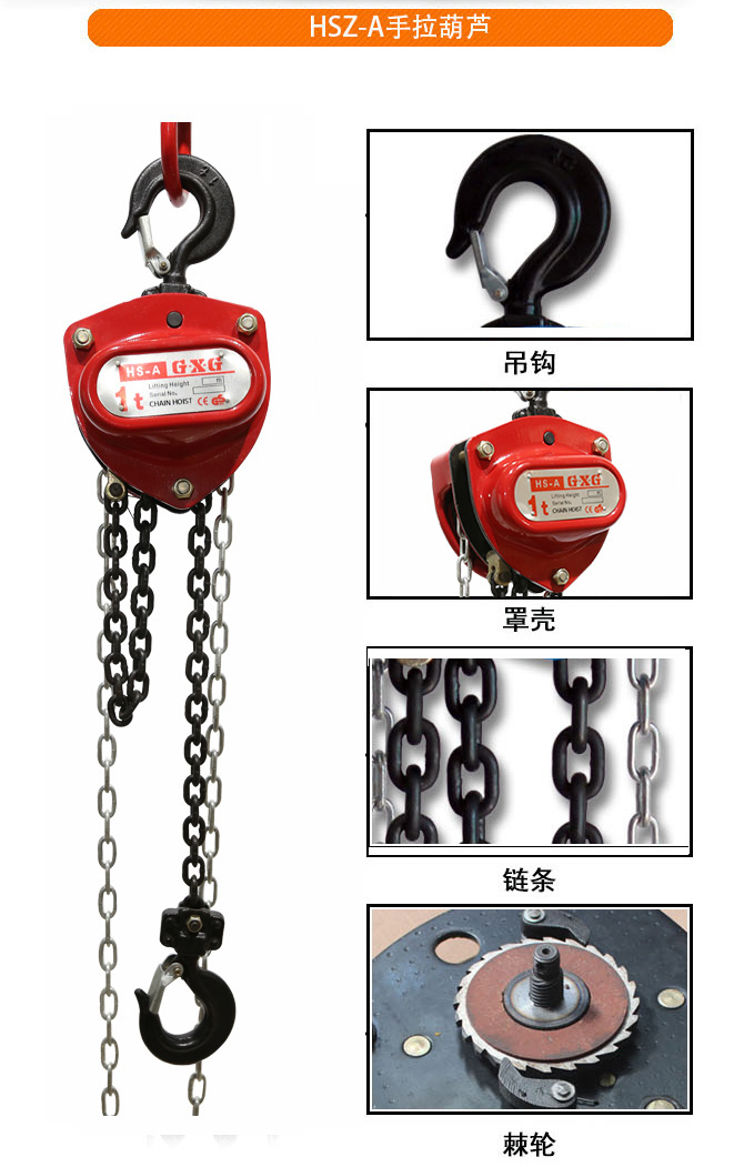 HSZ-A型手拉葫蘆又叫神仙葫蘆、斤不落、手動葫蘆,是一種使用簡單、攜帶方便的手動起重機械,也稱"環鏈葫蘆"或"倒鏈"。它適用于小型設備和貨物的短距離吊運,起重量一般不超過100T。手拉葫蘆的外殼材質是優質合金鋼,堅固耐磨,安全性能高。