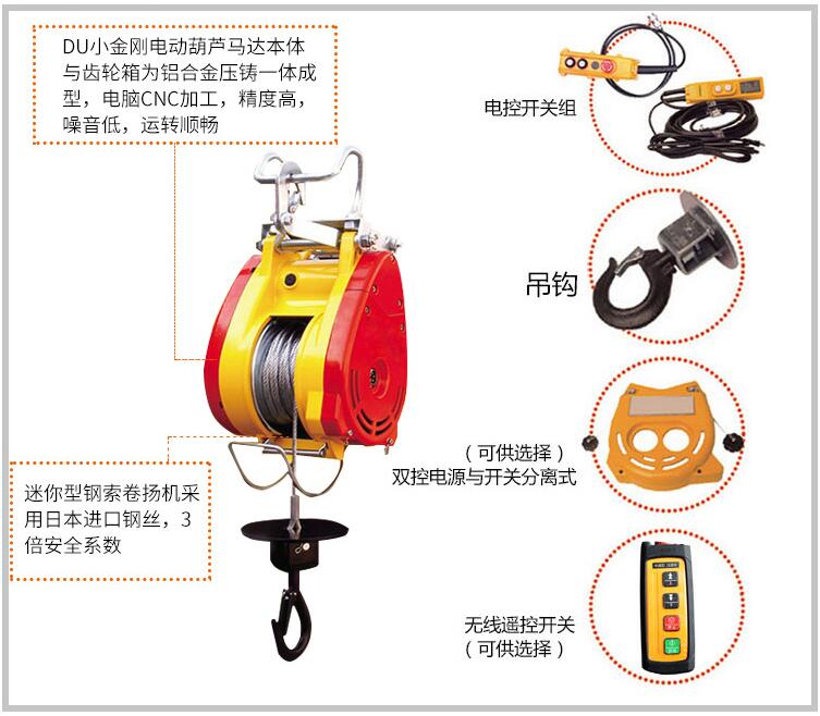 小金剛電動葫蘆是鋼絲繩電動葫蘆的一種,220V單相電源電壓,產品外形美觀,體積小、自重輕、小巧玲瓏。它又稱迷你電動葫蘆,懸掛端是雙保險,可以保證安裝的穩固性。小金剛電動葫蘆外殼是鋁制的,散熱比較好,鋼絲繩承載重物,電機是個馬達,力氣比較大,速度比較快,大概23m/Min。小金剛提升速度快,一般的鋼絲繩電動葫蘆的提升速度為8米/分鐘,小金剛電動葫蘆提升速度可達到23米/分鐘。小金剛電動葫蘆為掛鉤式,安裝簡單方便。